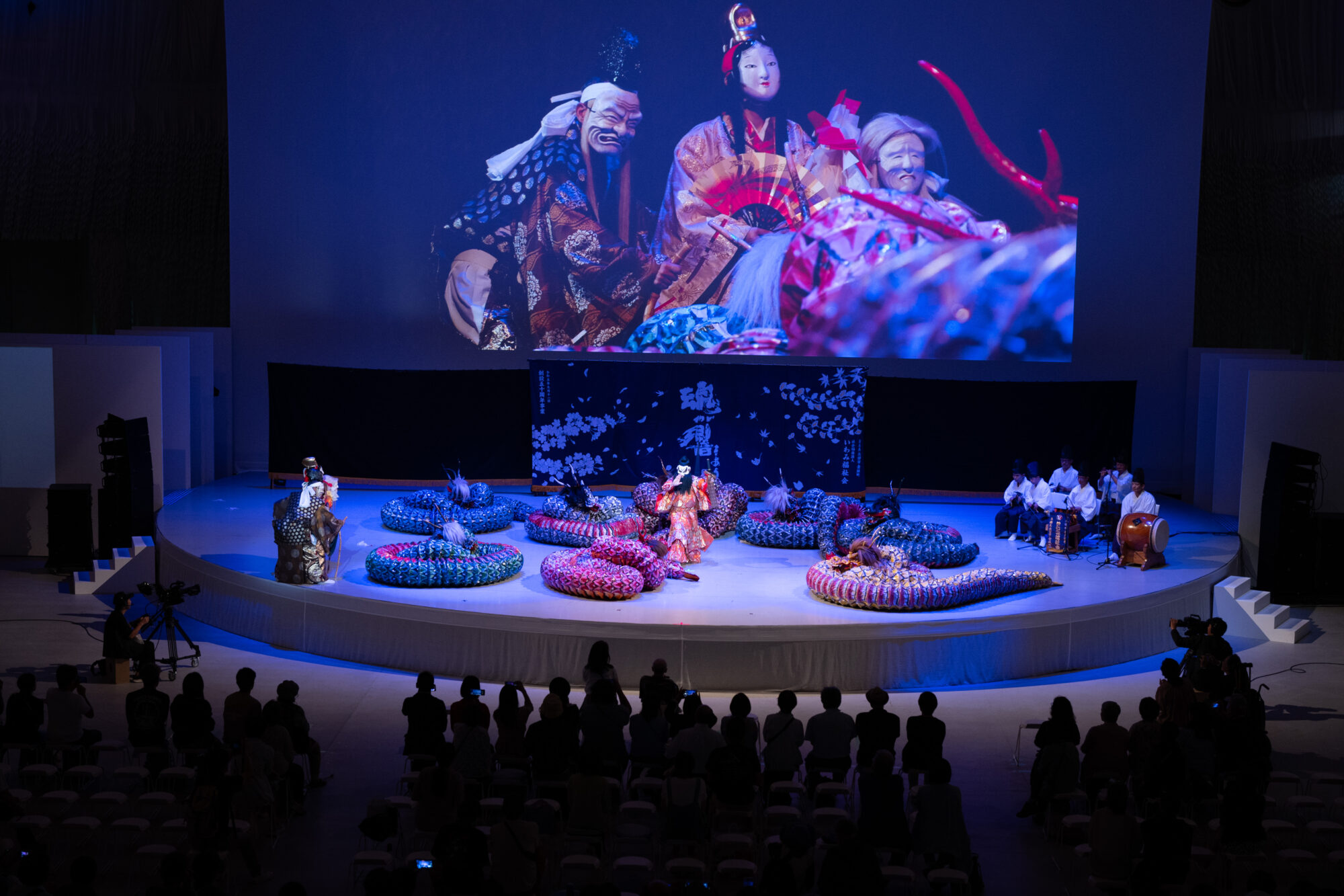 当日のステージでは、力強い太鼓と掛け声に合わせ、須佐之男命(すさのお)と大蛇が迫力の戦いを展開。8体の大蛇が息を合わせて躍動する姿は圧巻で、観客を魅了しました。