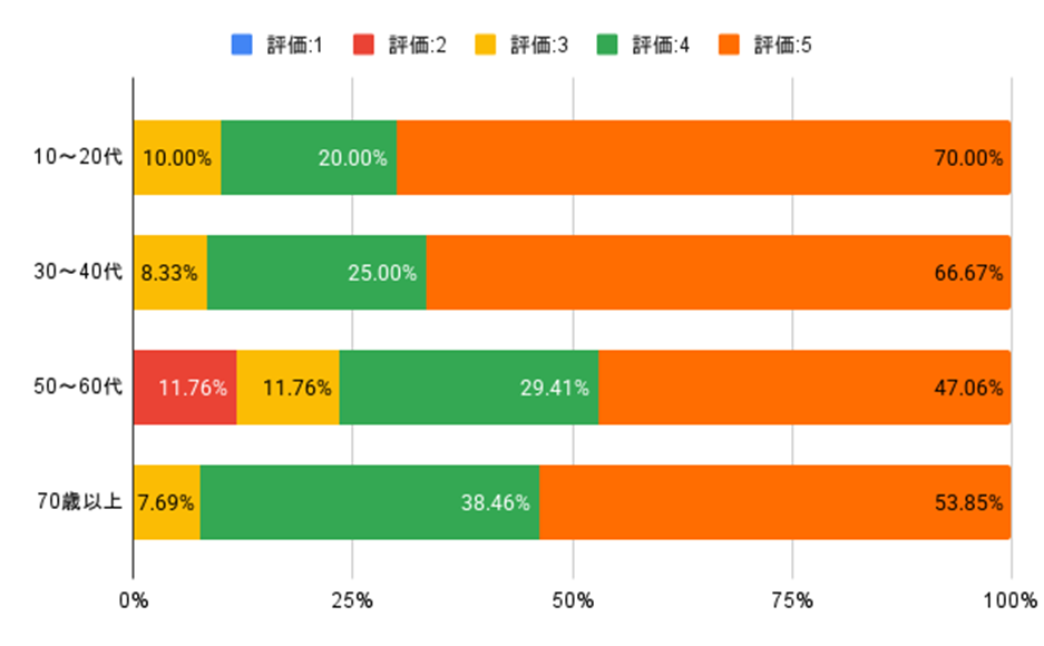 特に、10~20代については別の作品も日本語字幕付きで見たいという評価に対し、評価4以上を付けたユーザーが90%以上となるなど、多くの人々にとって好感触でした。また、評価2を付けた方々は50~60代に集中しました。